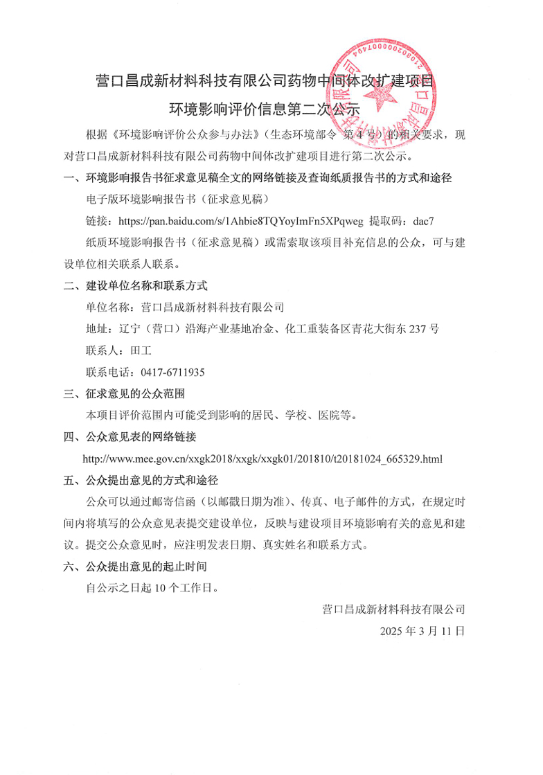 營(yíng)口昌成新材料科技有限公司藥物中間體改擴(kuò)建項(xiàng)目環(huán)境影響評(píng)價(jià)信息第二次公司